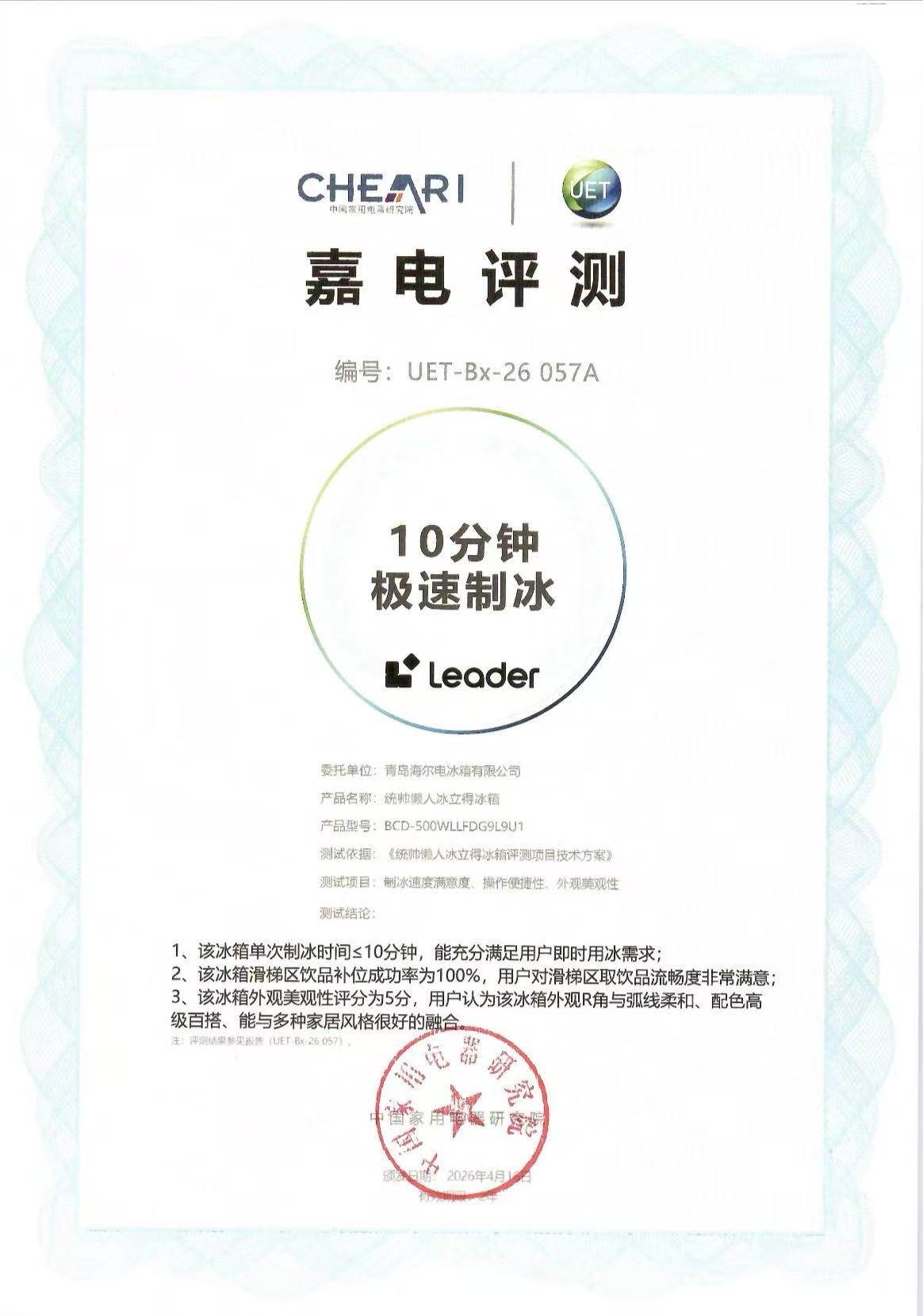 4 月 16 日,依托中国家用电器研究院权威标准体系设立的专业第三方机构嘉电评测,正式为统帅 懒人“冰立得” 冰箱颁发 “10 分钟极速制冰” 专项认证证书。本次认证围绕制冰核心性能、操作便捷性、家居适配性三大核心维度,为制冰冰箱品类建立了权威可量化的参考标尺,也为消费者选购提供了专业依据。
