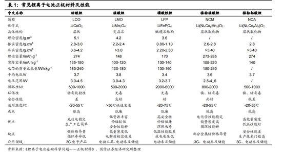 细分起来,正极材料有五大类,主要包括磷酸铁锂(LFP)、镍钴锰酸锂(三元材料、NCM)、锰酸锂、钴酸锂、镍钴铝酸锂。